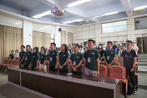 奏唱团歌后,田超向新晋助理营员们介绍了数统学院团委学生会组织架构。他提到,数统学院团委学生会由团委、学生会和融媒体中心三部分组成,是一个温暖和谐的大家庭,并且希望各位团学干部可以各司其职,团结互助,延续团学的辉煌。
