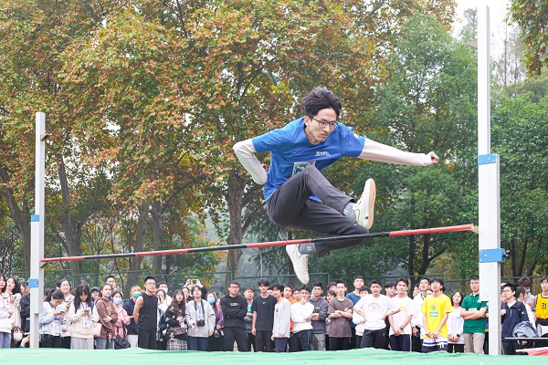 比赛进行到第二轮,选手陈禺怀和罗青松跃杆,率先杀出重围,数统学院其余两位选手则止步于1.44m。横杆逐轮升高,不断有选手离场。蓄势猛发的陈禺怀一跃飞过1.55m的高度,获得冠军。随后上场的罗青松沉着冷静,专注比赛,二跳之后获得比赛亚军。