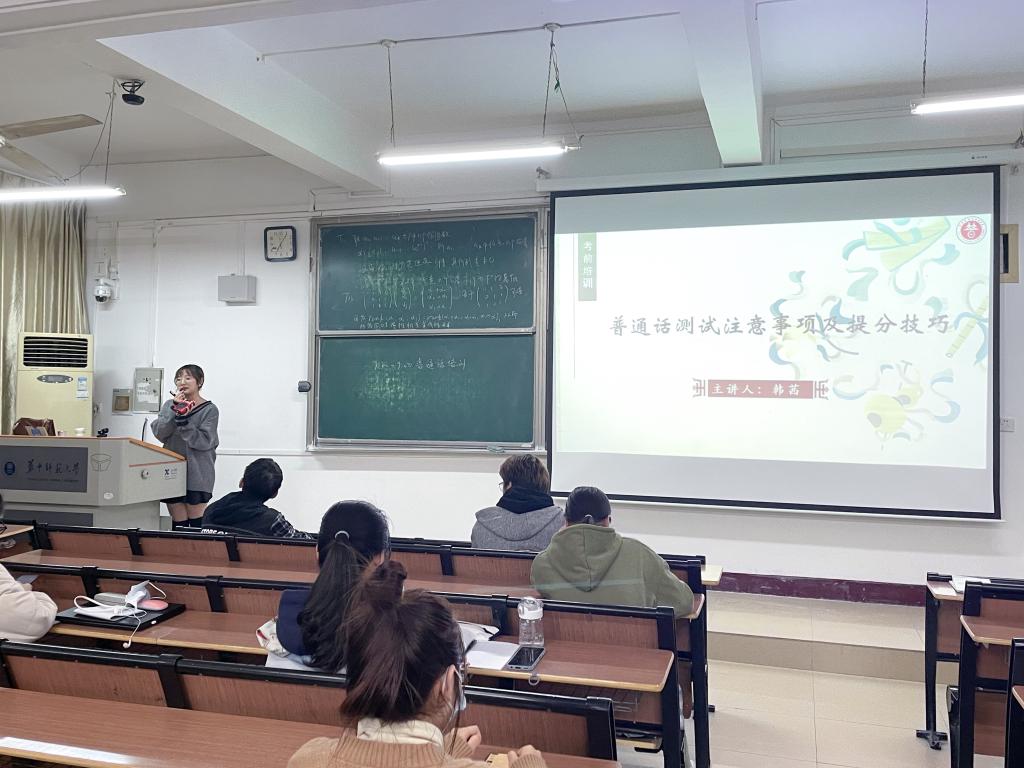(通讯员 程佳薇 王昊天)11月13日晚,华中师范大学数学与统计学学院(以下简称“数统学院”)普通话考前培训在6301教室如期举行。本次培训由普通话推普团团长韩茜担任主讲,数统学院20级本科生范逸杰主持,80余名数统学院本科生参与此次培训。本次培训主要介绍了普通话测试注意事项及提分技巧。