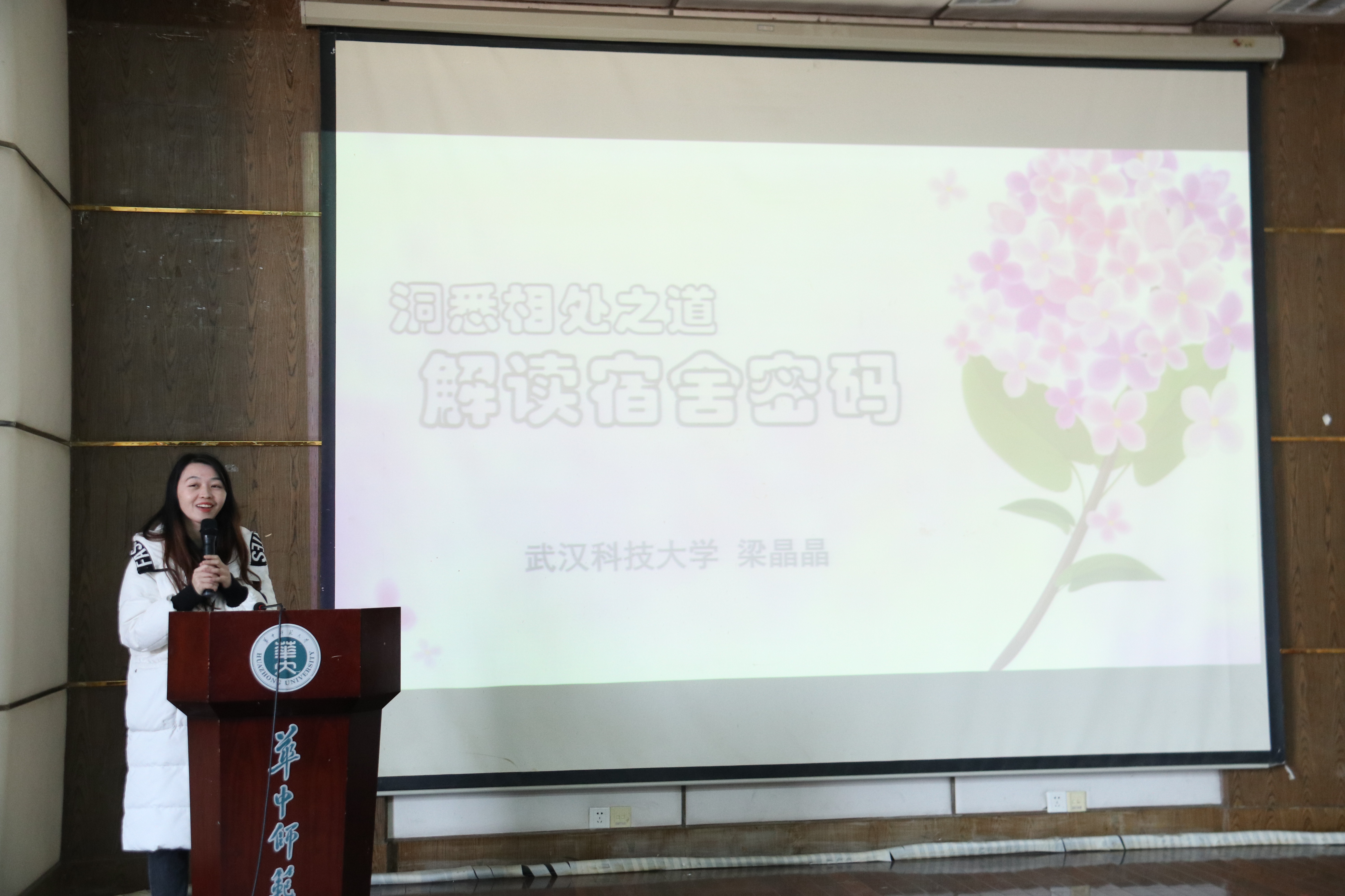 专题培训环节,梁晶晶老师带来题为《洞悉相处之道,解读宿舍密码》主题讲座。梁老师从“走进宿舍现状”、“聚焦关系觉察”和“解密相处之道”三个方面,结合具体事例为同学们阐释宿舍关系的密码。讲座伊始,梁晶晶播放《宿舍小剧场》视频,引发在场同学对现实中宿舍关系的思考,并结合视频内容详细叙述了现实中宿舍的作息时间大作战、卫生习惯有差异等各种可能出现的矛盾。