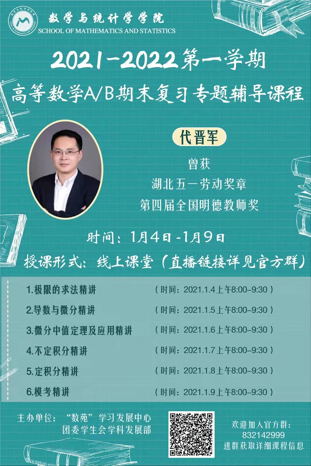 (通讯员 齐琪)1月4日至1月9日,由数学与统计学学院(以下简称“数统学院”)“数苑”学习发展中心和团委学生会学科发展部联合举办的高等数学期末复习专题课程通过高教考试在线顺利开展。此次课程邀请到数统学院副教授代晋军担任主讲人,来自全校不同学院共1500余人次参与本次辅导活动。