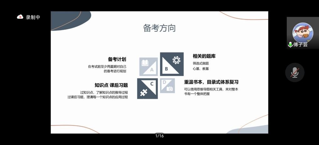 第二位分享者2020本科生级傅子芸则以“在路上”为主题向大家分享自己的经验。从专业学习的角度,她向同学们提议要对基本定理、定义进行深入理解,建立自己的知识体系以及要注意谨慎刷题;从师范生的角度,她向同学们介绍了校内专业性师范生技能比赛,鼓励师范生们积极参加师范生技能比赛,并向大家推荐了一些网络资源,建议大家学习优秀的名师讲解,多模仿,多借鉴。最后,她建议和鼓励大家积极参加志愿活动。