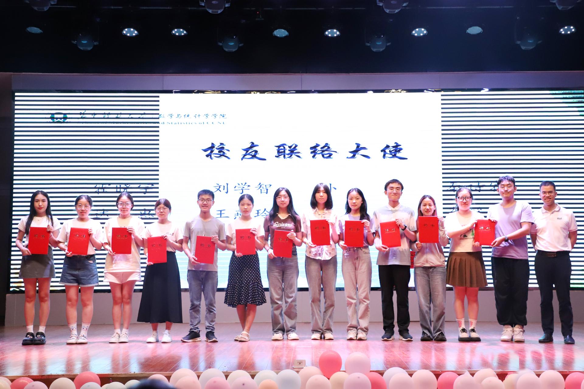 谢庆棠为2023年春季谢庆棠创达奖学金获得者颁奖,周远扬为2023届数统学院校友联络大使颁发聘书。