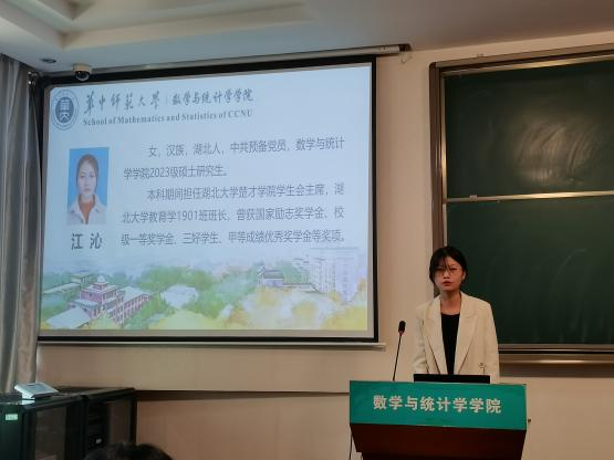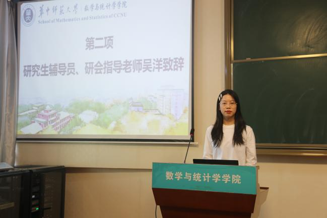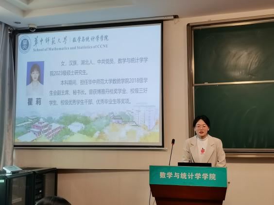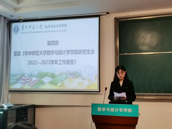 会议第四项,数统学院第十二届研究生会主席团成员徐子贤宣读《华中师范大学数学与统计学学院研究生会2022-2023学年工作报告》。她回顾了过去一年以来研究生会在制度改革、学术发展、文体活动等工作中取得的成效,并针对如何进一步筑牢思想建设、加强内部管理、创新工作方法进行了展望,希望新一届研会成员能团结一致,全心全意服务师生,为学院蓬勃发展贡献力量。