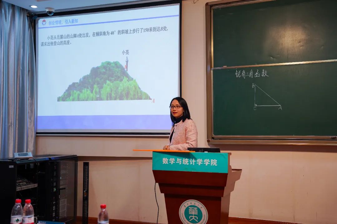 在现场观众的热烈的掌声中,黄乔玉进行《锐角三角函数》示范课展示?;魄怯窠栌迷缆瓷降氖悠档既肟翁?,通过平面上的登山问题引入“直角三角形中角的对边与斜边的关系”这一知识点。随后从特殊推及一般,详细讲解了正弦、余弦和正切的定义,同时通过具体的例题加深对定义的理解。在课堂最后,黄乔玉通过一段科普视频为同学们拓宽视野。在授课过程中,黄乔玉巧借视频、几何画板、小组合作等多种形式丰富教学内容,建立有效师生互动,充分调动学生学习主动性。