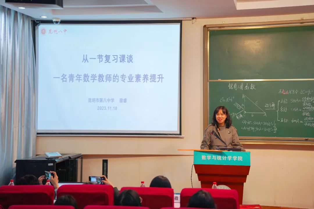 (通讯员 戴婉婷)为提升师范生专业能力素养,搭建师范生与国家级一线名师沟通交流的桥梁,11月18日晚数学与统计学学院(以下简称“数统学院”)于六号楼6401报告厅开展“薪火相传 共承华章”国培学科领军教师优质课展示活动。此次展示活动特邀湖南师大附中博才学士中学课程与教学处主任黄乔玉,云南省优课名师、春城计划拔尖人才撒睿担任主讲人,数统学院党委副书记杨可军、“数苑”学习发展中心指导老师龙星宇、蔡子尧出席活动现场。