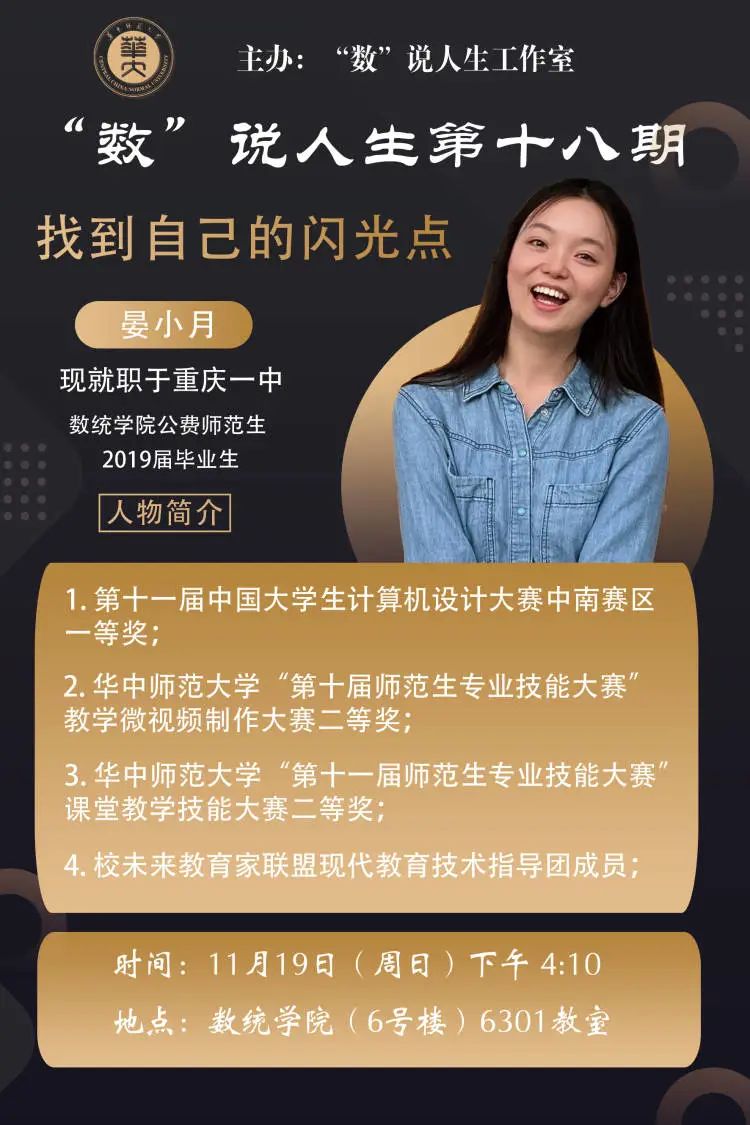 (通讯员 代鹂璐)11月19日下午,数学与统计学学院第十八期“数”说人生校友讲坛于六号楼6301举行,本期的主讲嘉宾是数统学院2019届公费师范生晏小月,现就职于重庆一中。曾获第十一届中国大学生计算机设计大赛中南赛区一等奖、华中师范大学“第十届师范生专业技能大赛”教学微视频制作大赛二等奖。活动由“数”说人生工作室指导教师李慧主持。