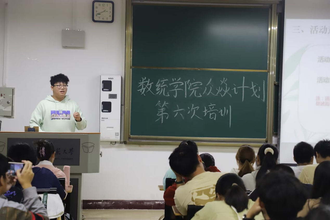 (通讯员 徐可欣 戴杰芮)11月4日下午,数学与统计学学院(以下简称“数统学院”)团委学生会第十六届“众焱计划”训练营第六次团干培训于六号楼6301教室举行。本次培训由数统学院组织部负责人李晨曦主持,团委学生会组织部全体负责人、团委学生会全体助理营员参加本次培训。本次培训旨在让各位助理营员明晰撰写活动策划书对于校园活动的重要性以及其基本要求。