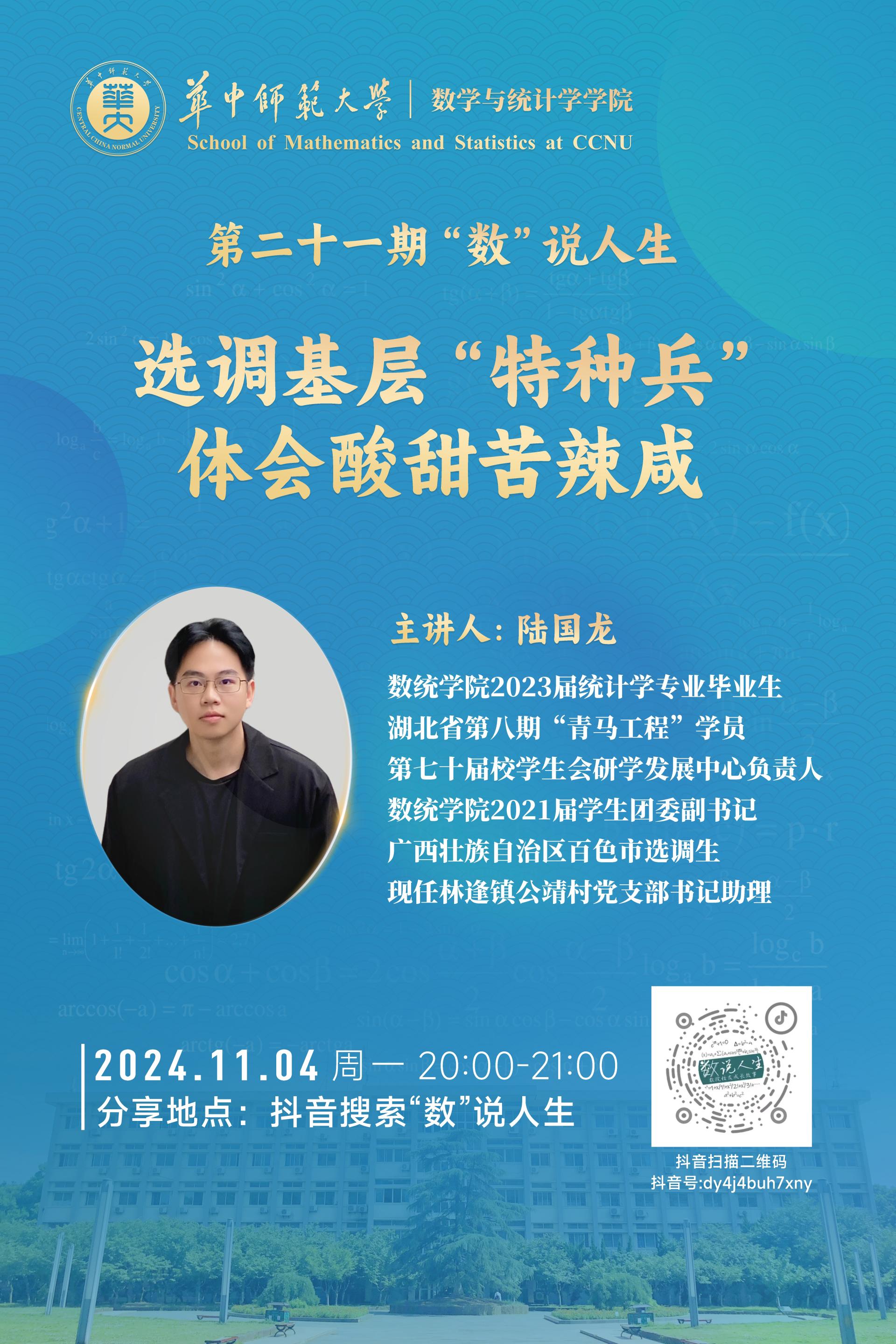 (通讯员 安摇)为构建学院高质量就业指导服务体系,强化生涯教育,加强就业指导,增进学生对选调生的了解,拓宽毕业生就业新思路,11月4日,数学与统计学学院(以下简称:数统学院)第二十一期“数”说人生校友论坛于抖音直播间顺利举行。本期讲坛由数统学院2023届本科毕业生陆国龙进行分享,讲坛由2021级本科生辅导员武靖主持。