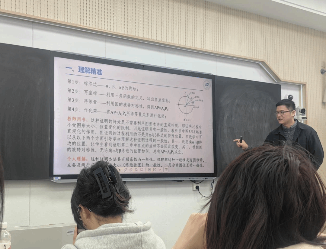 在备课指导环节,张丹以高中数学 “平面向量基本定理及坐标表示” 为范例,深入讲解备课流程。从剖析教材逻辑、挖掘知识背景,到示范情景化导入,再到强调教案撰写中以学生为主体的目标设定与知识过渡,老师毫无保留地传授经验。小组成员认真记录、积极提问,逐步构建起系统的备课思路,为后续教学实践筑牢基石。