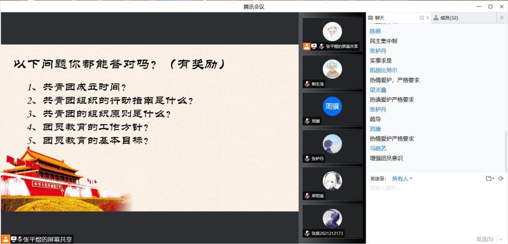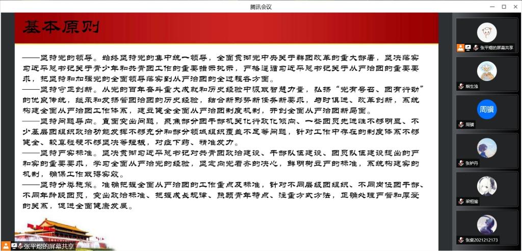 (通讯员 张平煜)3月18日下午,为宣传学习共青团十八届六中全会精神,推进团支部建设,增强团员的责任意识,数学与统计学学院(以下简称“数统学院”)2102团支部于线上开展了三月份主题团日活动。活动分为三部分:共同学习共青团十八届六中全会精神、共青团知识问答和总结发言。2102全体团支部成员参加本次活动。