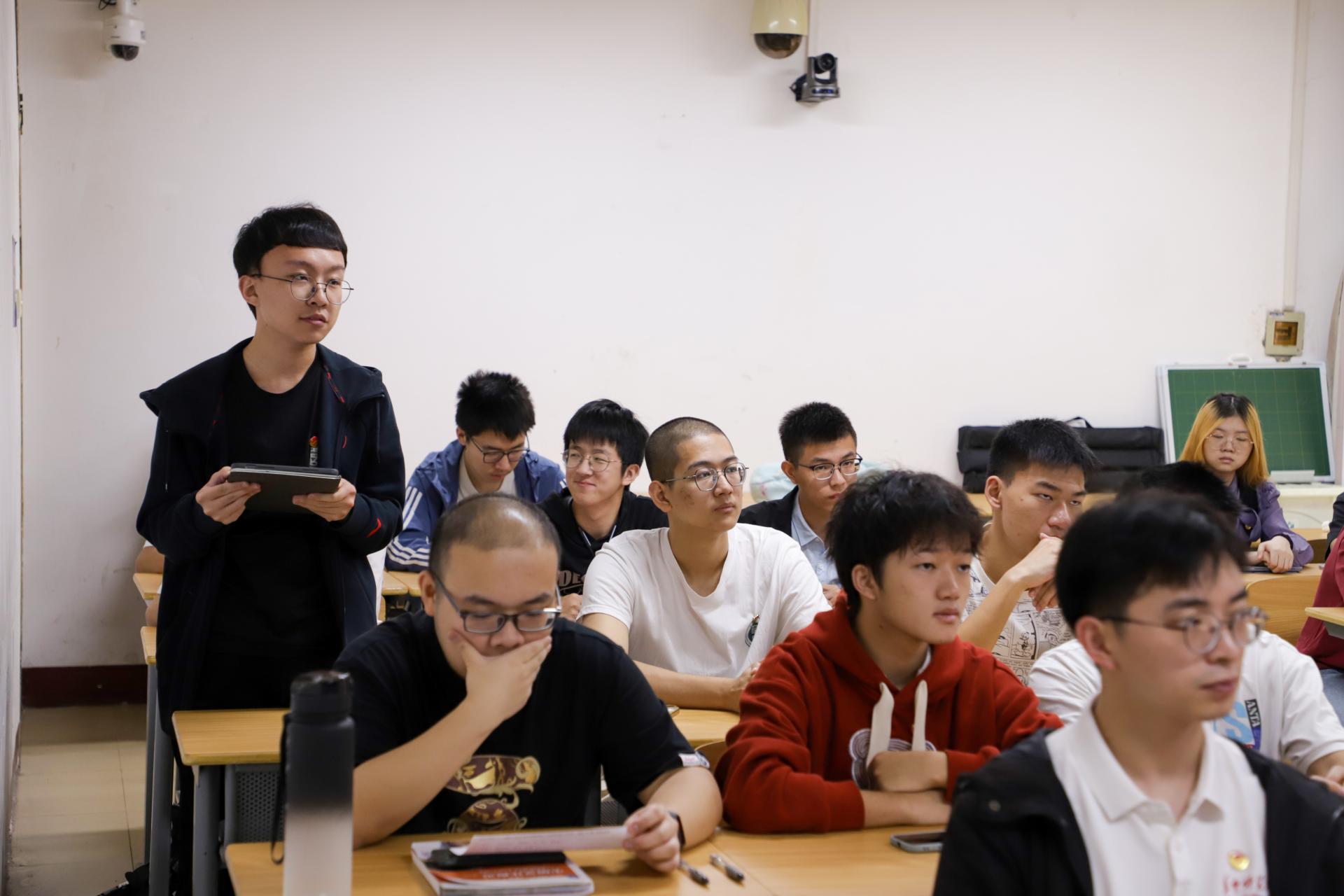 “在阅读习近平总书记对青年学生的殷切嘱托后,我深刻体会到青年学生应该从小事做起、善小而为、日积月累”。何晨向在场同学分享阅读《习近平与大学生朋友们》的感悟,要脚踏实地增强自己的实干本领,并在实践中深入学习、启发思考、不断创新。向汉阳以知识问答形式,巩固同学们在此次主题团日的学习成果。
