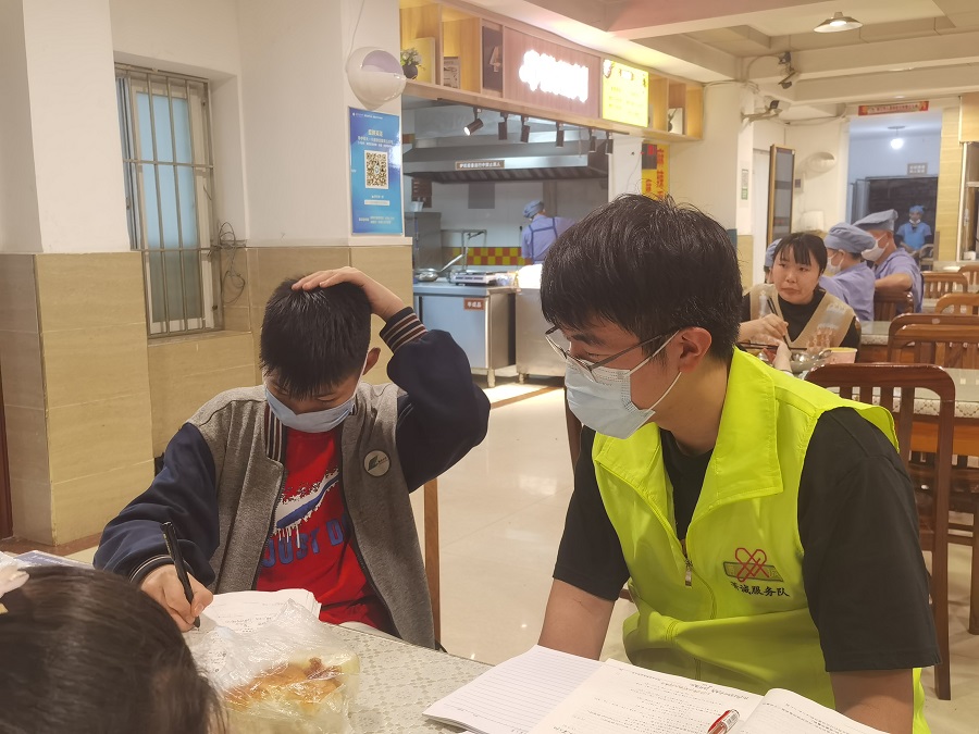 华大数统 (通讯员 罗显涛) 3月17日晚上,华中师范大学数学与统计学学院青年志愿者协会(以下简称“数院青协”)组织五名志愿者前往学子食堂顺利开展了食堂职工子女辅导志愿活动。本次活动旨在为小朋友们答疑解惑,督促小朋友完成作业,培养他们良好的学习习惯,并以此来感激辛勤付出的食堂工作人员。