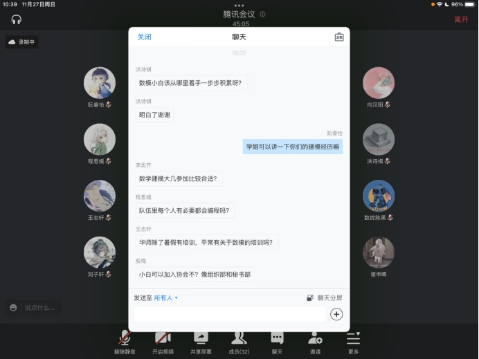 (通讯员 梁怡龙)11月27日上午,为使新生了解到数学建模的相关知识,积极参与到数学建模比赛中,华中师范大学数学建模协会(以下简称“数模协会”)于线上第一次经验分享交流会。本次活动由数模协会会长向嘉艺,副会长阮睿怡,全国数学建模比赛一等奖得主肖宇淇主讲。