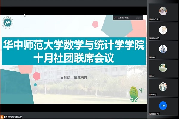 (通讯员 董嘉怡)为推动社团文化建设,吸纳新鲜血液,10月29日晚,数学与统计学学院(以下简称“数统学院”)十月份社团联席会议于线上展开。数统学院主席团成员周垚、社团部全体负责人、全体数统学院挂靠社团代表出席本次会议。社团部负责人王然主持会议。