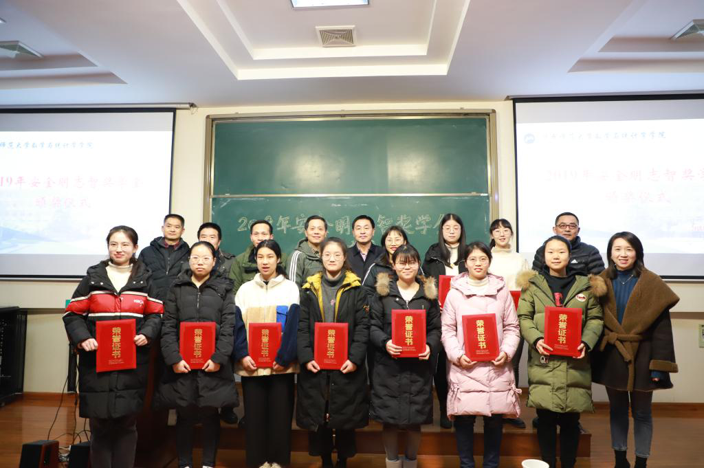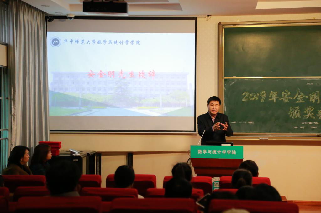 此次颁奖仪式由田俊主持,仪式第一项由王中致辞并宣读2019年安金明志智奖学金获奖名单。根据《华中师范大学数学与统计学学院安金明志智奖学金章程》及评审委员会审定,2017级赵宇、贾凯玉、程嵘、王璇、夏子言,2018级刘思伶、葛柳青、周童、韩秋玥、王雪娇获得2019年安金明志智奖学金。