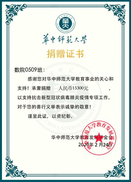 2月24日,数统学院2005级09班班长李昆把9班校友捐赠的15300元钱转入华中师范大学教育发展基金会的账户。他说:“作为从华师毕业的学生,疫情当前,我们只是做了一些力所能及的事儿?!?/p>