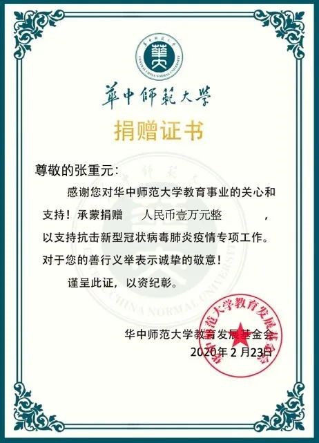 2月23日,远在西安的数统学院1962级02班校友张重元向华中师范大学教育发展基金会捐款一万元。尽管学院校友工作联系人再三婉拒,但张老师坚持道:“母校对我是大海一般的恩情,现在武汉情况危急,学校有困难,我一定要尽一份力?!?/p>