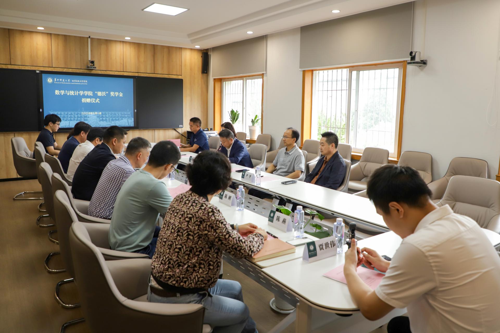 (通讯员 龙星宇)10月1日,“德沃”奖学金捐赠仪式在六号楼M323会议室举行。深圳市德沃实业发展有限公司董事长、深圳市江财人教育管理有限公司董事长詹伟哉,深圳市德沃实业发展有限公司董事张秀文,校党委常委、副校长彭双阶出席,学校教育发展基金会、数学与统计学学院相关负责同志以及数学系83级校友代表参加。