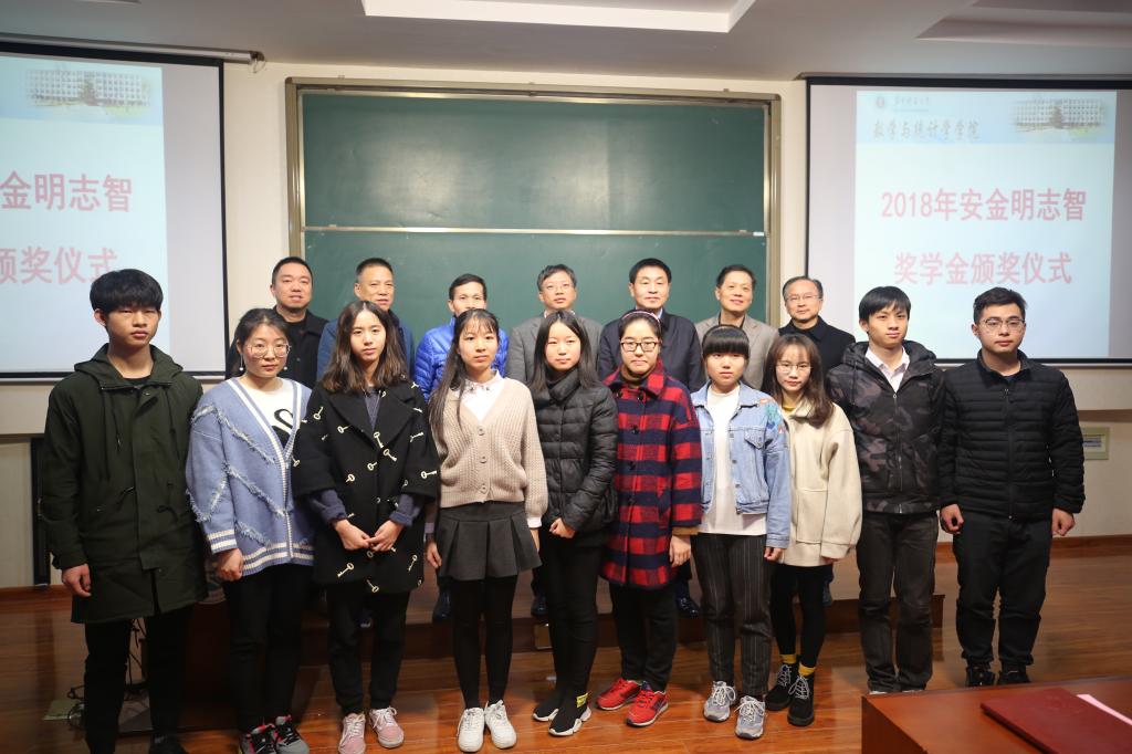 随后数统学院院长彭双阶宣读2018年安金明志智奖学金获奖名单。接着大家一起观看了获奖同学的介绍视频。观看结束后,安金明校友和学校学工部副部长王东爽共同为获奖学生颁奖。