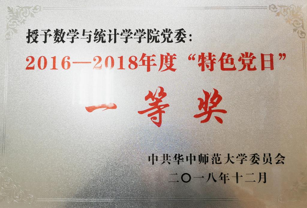 2019年1月17日,学校下发《关于表彰2016-2018年度“特色党日”活动获奖单位的决定》,经自主申报,评委会评审,共评选出“特色党日”活动一等奖8个,二等奖10个,三等奖17个。其中,数学与统计学学院被评为学校“特色党日”活动一等奖单位。