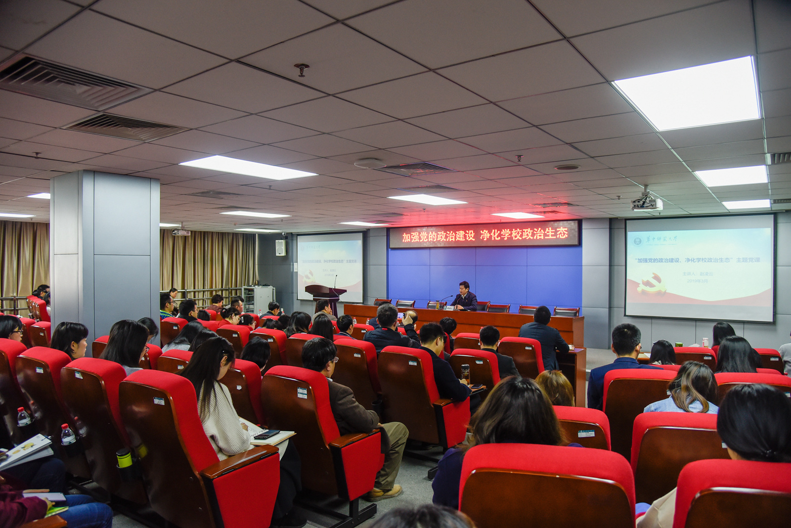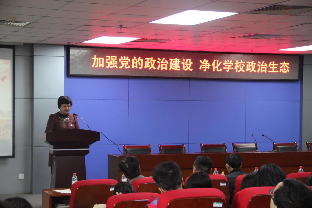 赵凌云以“加强党的政治建设,净化学校政治生态”为主题进行报告,提出了三点学习体会。一要旗帜鲜明讲政治。“党的建设千万条,政治建设第一条”赵凌云列举我党发展历程中因为不讲政治而造成的“血的教训”,启示党员要把政治建设、政治纪律、政治生态放在首位;二要身体力行构生态。要把重构政治生态作为我校当前最大的政治任务来完成。他认为,每个人都是政治生态里的一份子,构建政治生态是每个人的责任,大家都要做“清醒人”、“明白人”,提高自己的政治站位,用党员的标准要求自己,积极做好党员、好老师、好同事;三要真抓实干筑高峰。他指出要通过发展来提升学校地位,把优化政治生态落实到真抓实干和全面贯彻落实党中央的决策部署上来。