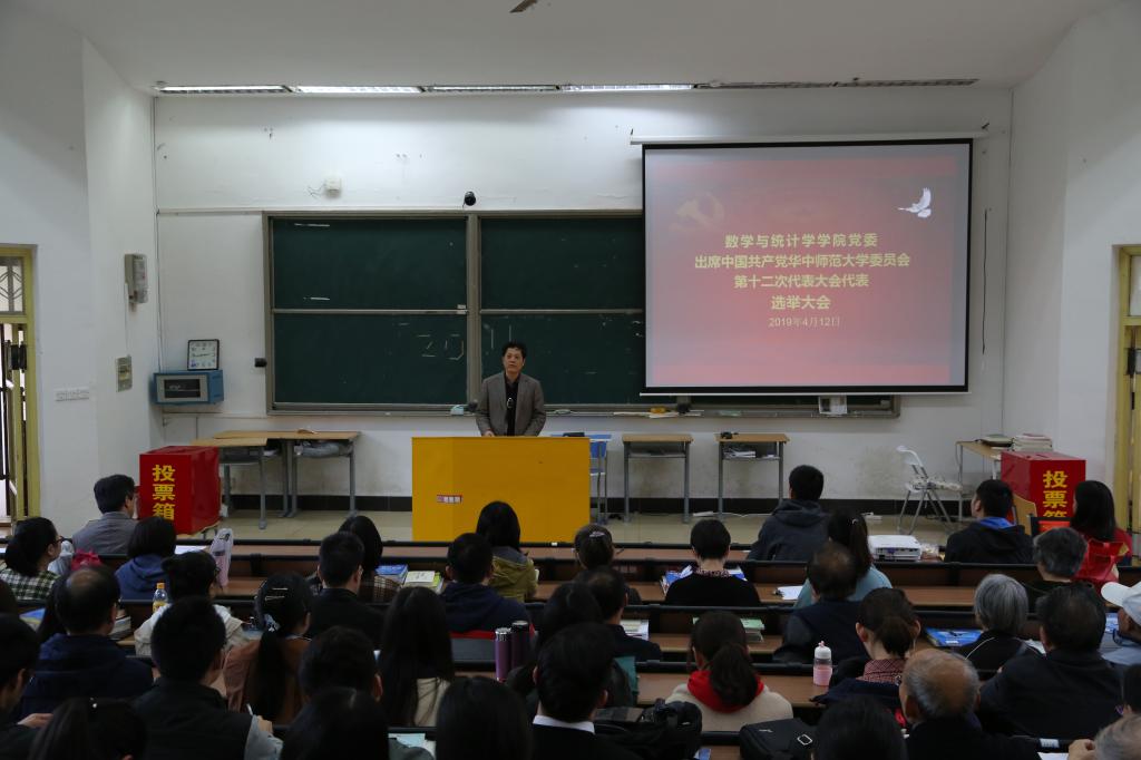 4月12日下午,中共华中师范大学第十二次党代会数统学院代表选举大会在数统学院一楼6101教室顺利举行,在职教职工党员、离退休党员和学生党员参加了选举大会。大会由我院党委书记王中主持。