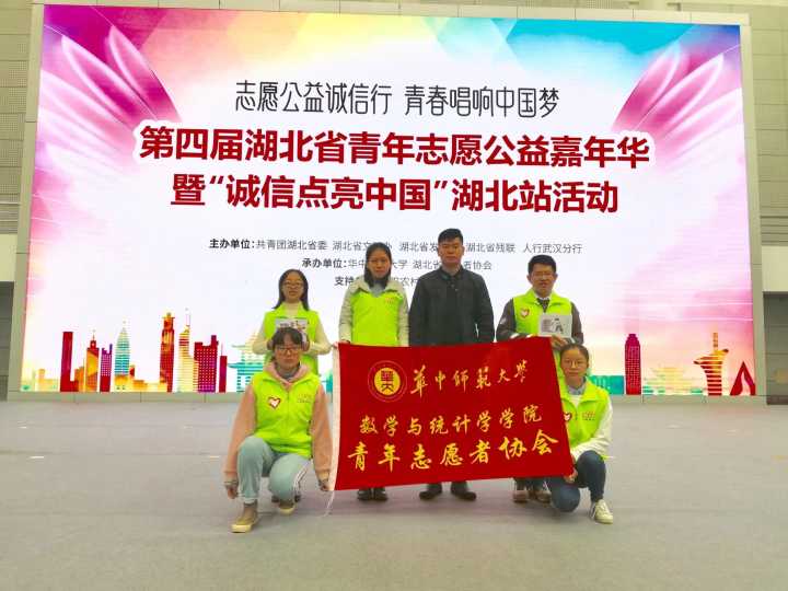 2018年青协受邀参加第四届湖北省青年志愿公益嘉年华。团委书记谢定一、副书记闫岩、会长周玉、副会长何俊霆等十余名青协代表参加此次交流。