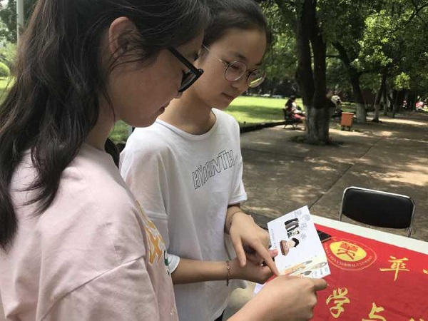 左欣:阿姨,我们是华师数统青年志愿者协会的,这是我们“漫说心语——反校园暴力”的志愿服务项目。主要是通过漫画的形式来向中小学生普及反暴力知识。漫说心语第一期以武汉市春苗学校为服务基点而实施。前期,我们针对教师、家长、学生三个群体准备了调查问卷,进行调查分析。整合结果后根据实际情况构思了第一本漫画册并邀请我校美术学院专业同学画出漫画。