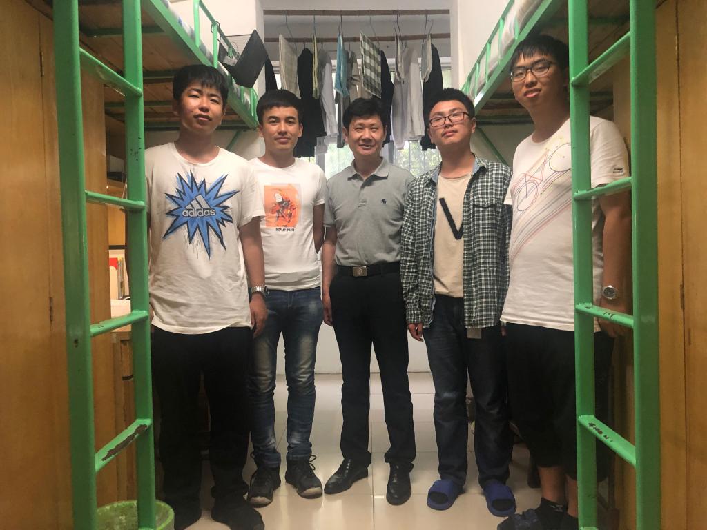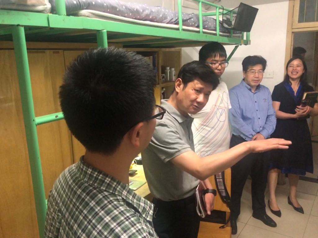 校长、校党委副书记赵凌云,本科生院副院长、党委学生工作部部长韩君华,本科生院副院长、党委学生工作部副部长李刁,院党委书记王中,院长彭双阶,院党委副书记田俊一行来到我院2018级学生宿舍,元宝山五栋123,看望四名本科生。