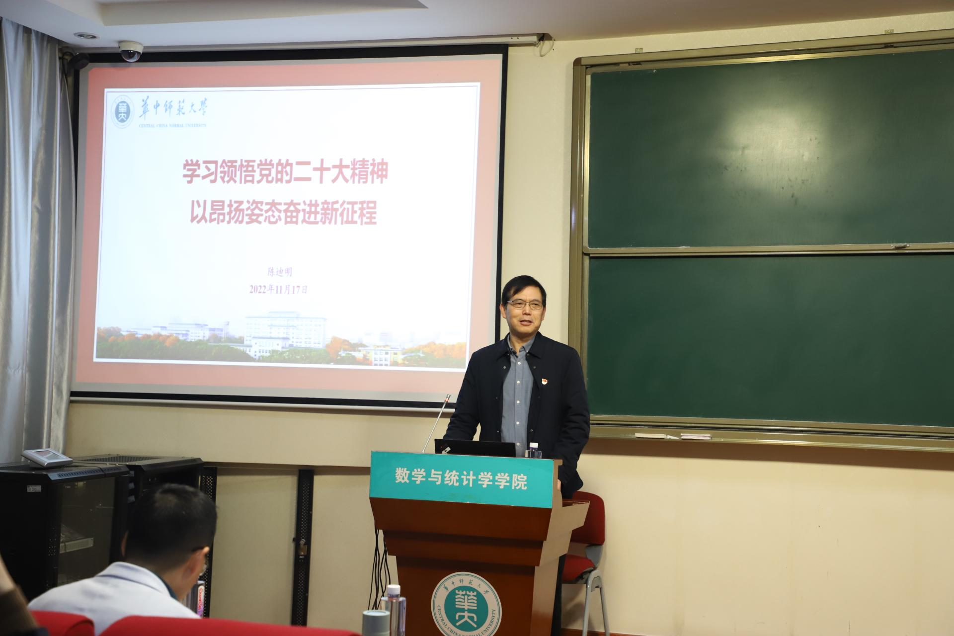 为深入学习贯彻习近平新时代中国特色社会主义思想和党的二十大精神,发挥党员领导干部联系基层、联系师生党组织的带头作用,不断增强学校党建与思想政治工作实效性,11月17日下午,校党委副书记陈迪明于六号楼6401室为数学与统计学学院师生作了“学习领悟党的二十大精神,以昂扬姿态奋进新征程”的专题报告。学院党委委员、班子成员、政工干部、教工党支部书记代表、2021级研究生第一党支部和博士生第二党支部全体党员、学院第11期发展对象培训班全体学员及其他研究生党支部党员代表参会,会议由学院党委书记刘成竹主持。