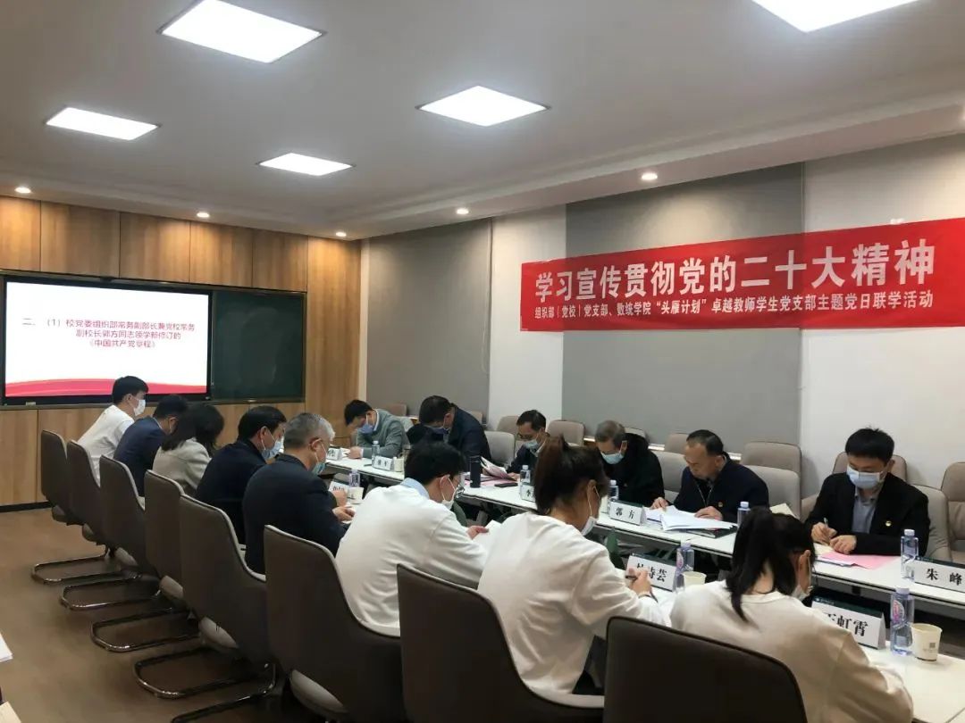 为深入学习宣传贯彻党的二十大精神,11月24日,组织部(党校)党支部、数统学院“头雁计划”卓越教师学生党支部主题党日联学活动在六号楼323会议室举行。校党委副书记查道林以普通党员身份参加活动。数统学院党委书记刘成竹、党委副书记田俊、“头雁计划”卓越教师学生党支部指导教师李书刚和部分学生入党积极分子代表列席活动。联学活动由“头雁计划”卓越教师学生党支部书记王奥林主持。