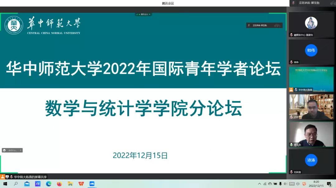 12月15日上午,华中师范大学2022年国际青年学者论坛数学与统计学学院(以下简称“数统学院”)分论坛于线上展开。华中师范大学副校长彭双阶,人事部部长游丽,数统学院党政班子、学术委员会主任、师生代表以及来自海内外的青年学者出席本次论坛。本次分论坛由数统学院科研副院长郭玉劲主持。