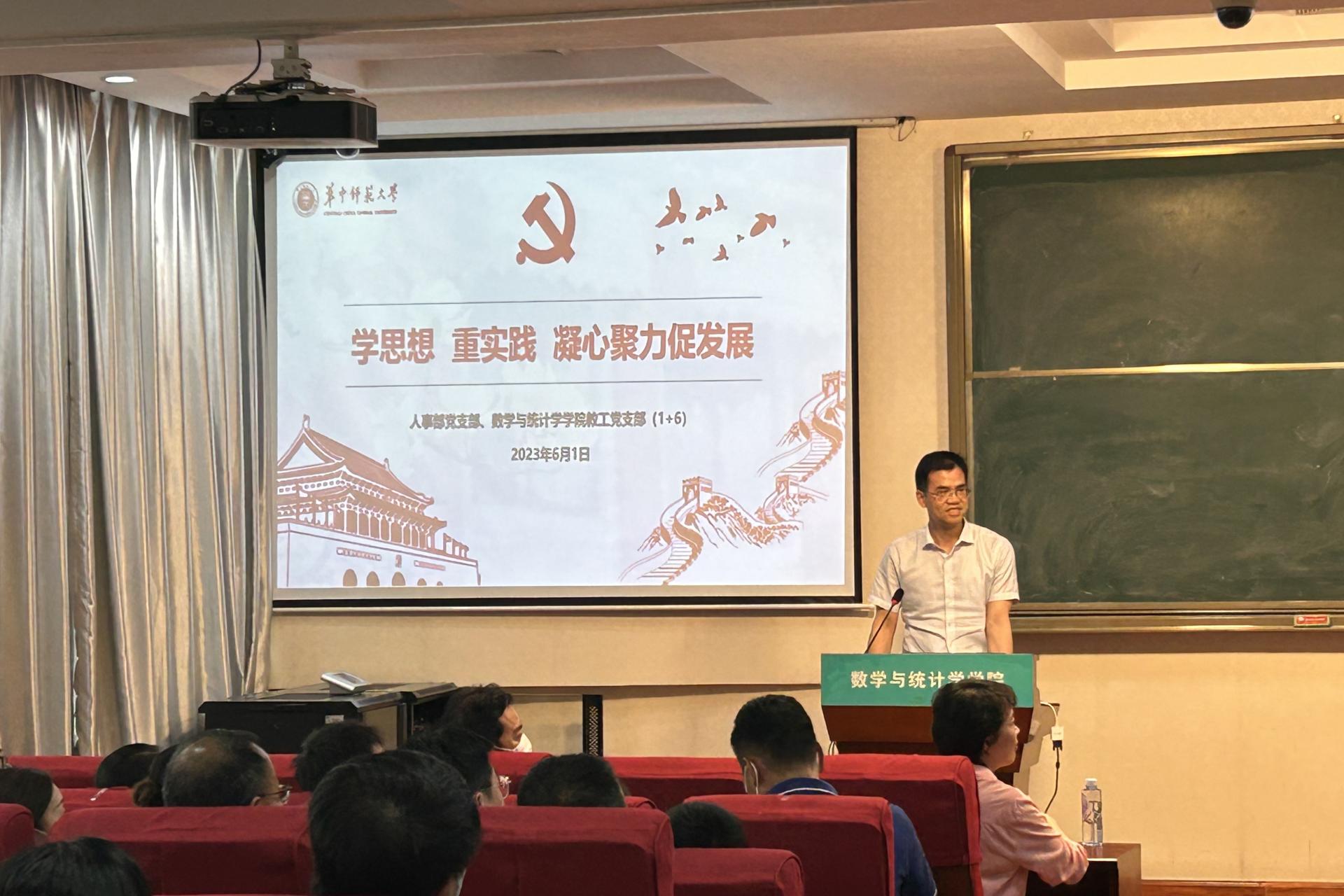 为深入开展学习贯彻习近平新时代中国特色社会主义思想主题教育,6月1日,人事部党支部与数学与统计学学院(以下简称“数统学院”)6个教工党支部开展“学思想,重实践,凝心聚力促发展”主题教育联学活动。学校主题教育联络协调组第四组成员高尚列席指导,联学活动由数统学院党委书记刘成竹主持。