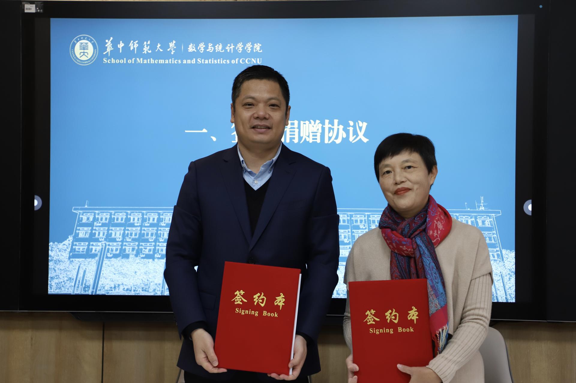 捐赠仪式上,数学系8304班校友向学院捐赠50万元,用于支持学院教育事业发展。华中师范大学教育发展基金会秘书长郭庆与数学系8304班校友代表、广州市85中学教师、广州市优秀教师唐庆华签署了捐赠协议,数统学院副院长左国新接收捐赠支票,刘继文代表学校为8304班校友代表唐庆华颁发捐赠证书、捐赠奖牌。数统学院党委书记刘成竹为8304班校友代表唐庆华赠送学院纪念品《桂子记忆》。