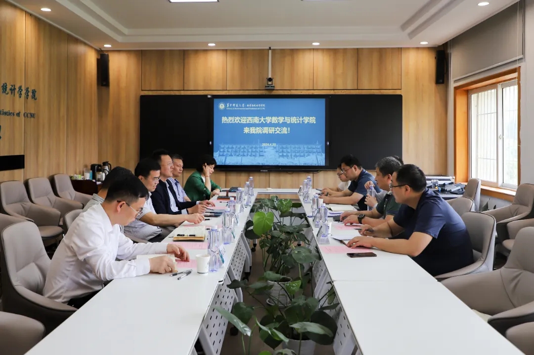 (通讯员 梁韵)4月23日上午,西南大学数学与统计学院来我院调研交流座谈会于六号楼M323会议室举行。西南大学数学与统计学院党委书记唐宇,常务副院长刘贤宁,副院长商彦英、邓圣兵,学院办公室主任畅敏一行来访参会。华中师范大学数学与统计学学院院长周远扬,副院长郑高峰、左国新、郭玉劲,学院办公室主任陈燕出席座谈会。会议由党委副书记周彦主持。