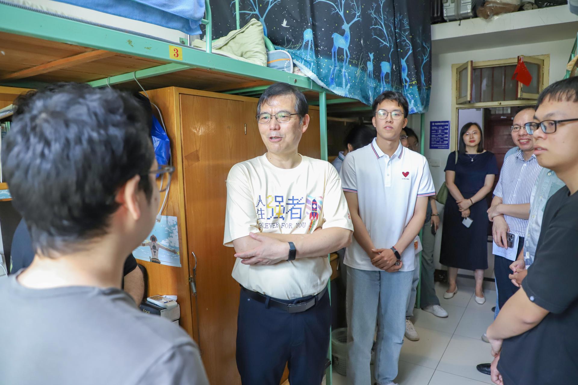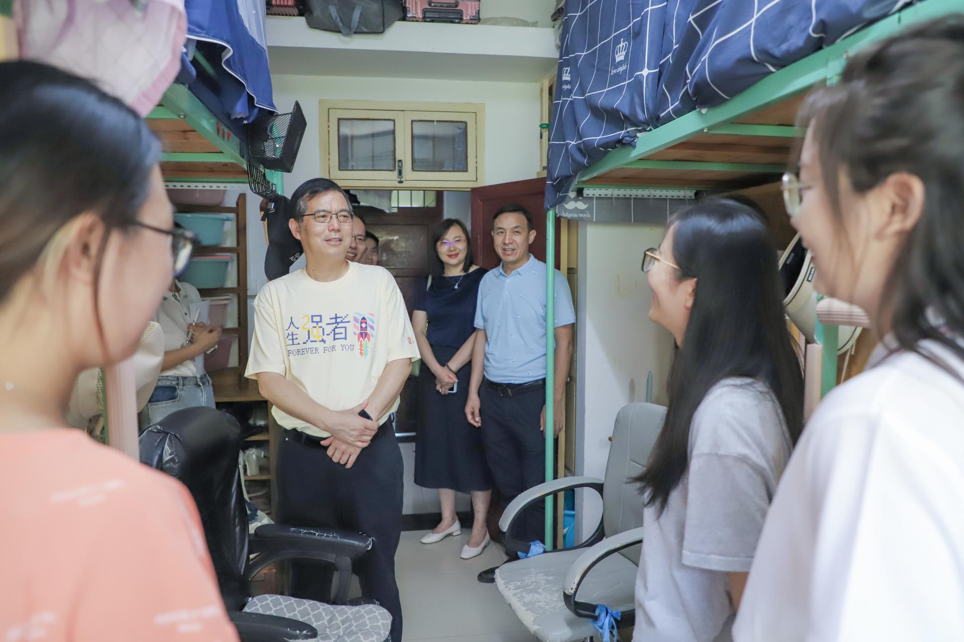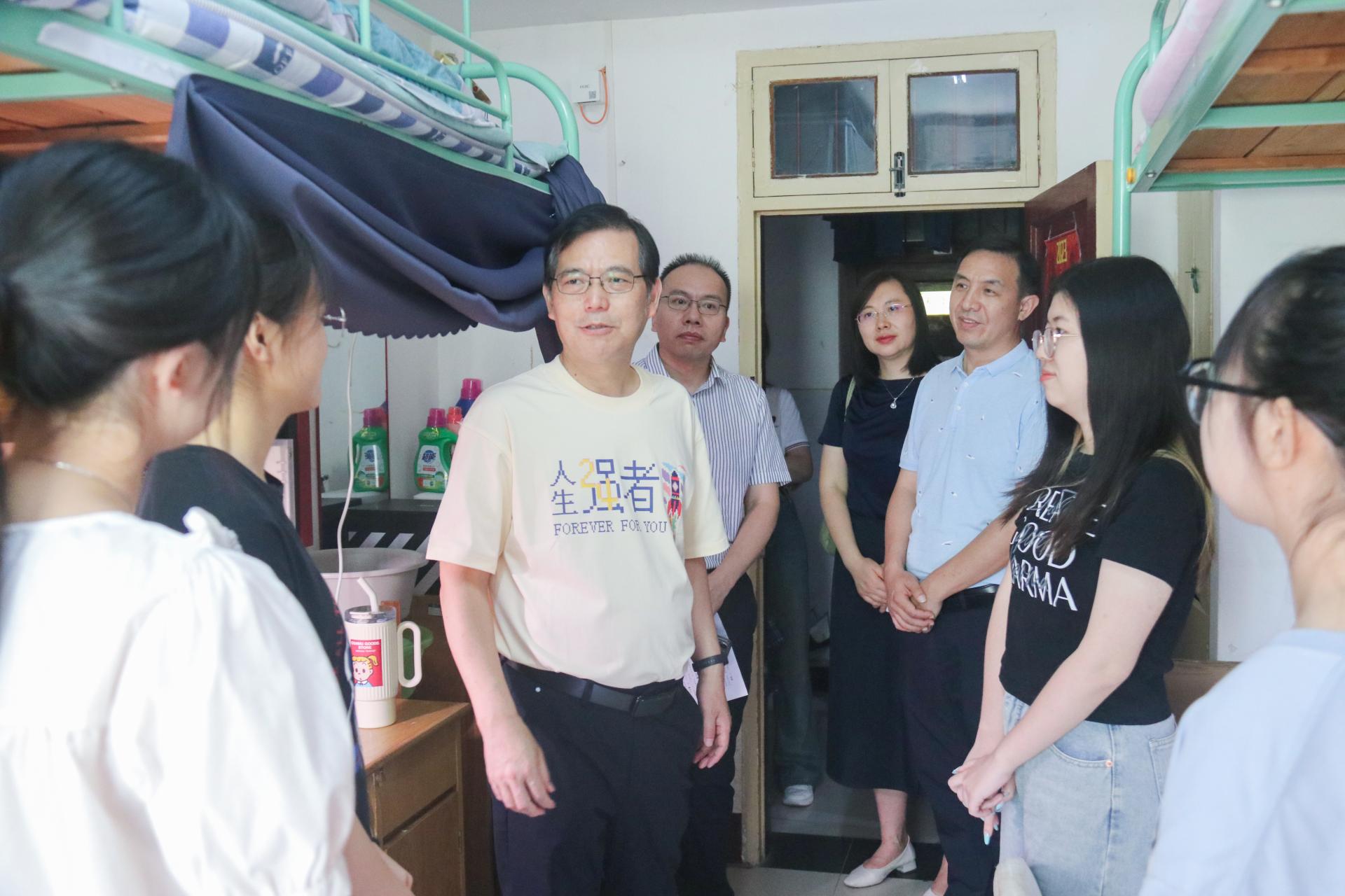 (通讯员 王丽婧)6月12日,校党委副书记陈迪明到东区学生宿舍1栋、12栋走访看望我院毕业生,与即将毕业的学子们亲切交流,共话青春梦想。党委学生工作部副处长李宪玲、思政办主任陈志,数学与统计学学院(以下简称“数统学院”)党委书记刘成竹、副书记杨可军、2020级辅导员武靖、张路阳等一同走访。