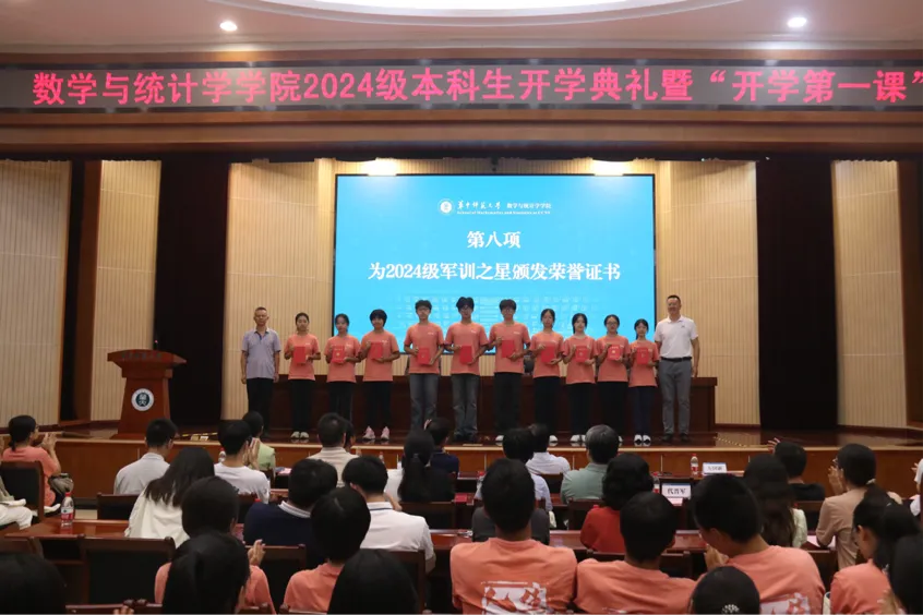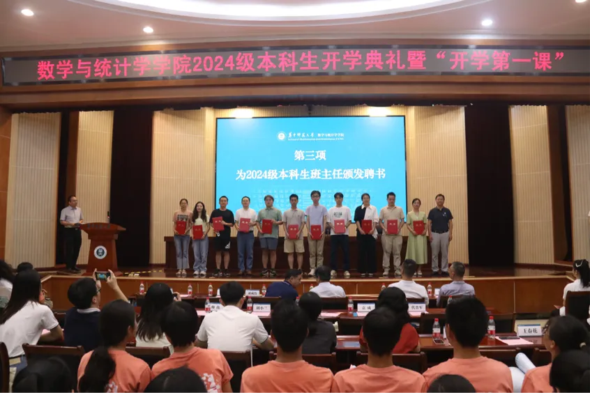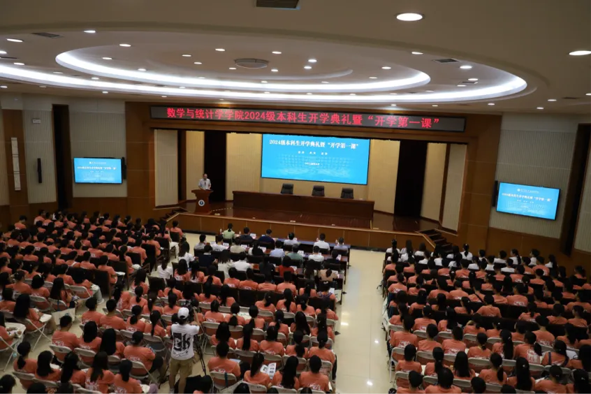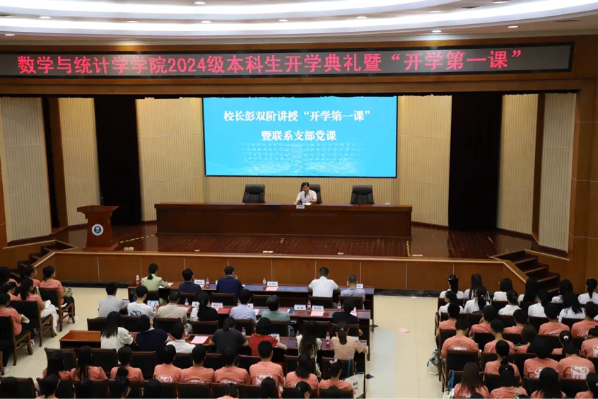 9月29日下午,数学与统计学学院(以下简称“数统学院”)2024级本科生开学典礼暨“开学第一课”在科学会堂一楼报告厅举行。校长、数统学院教授、博士生导师彭双阶,数统学院党委书记刘成竹,副书记周彦、杨可军,副院长郑高峰、左国新,2024级本科生班主任安丽想、陈德汗、代晋军、邓清泉、黄鑫、胡小兰、刘威加、帅伟、王春花、袁成、赵全庭,本科教学秘书丁文婷、易娟以及2024级辅导员曾爽、王怡蕴,2023级辅导员、院团委书记林诗芸、院团委副书记胡一心,2022级辅导员龙星宇、申墁烨,2021级辅导员武靖、李佳乐出席本次活动。开学典礼暨“开学第一课”由学院党委副书记杨可军主持。