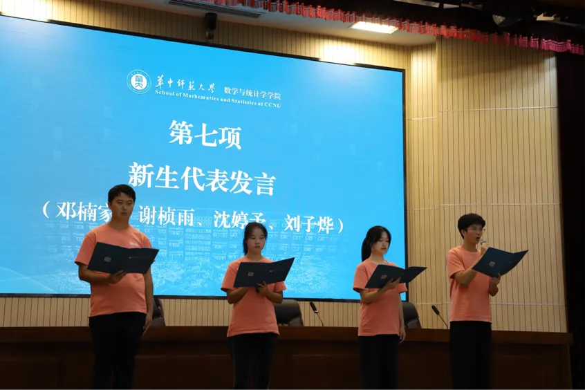 数统学院新生代表邓楠家、刘子烨、谢桢雨、沈婷予用朗诵的方式娓娓道出自己的故事。“躬耕学习,尽情追梦,踔厉奋发,砥砺前行”,他们代表数统学院2024级全体新生表示:纵使未来迷茫,纵使前路漫长,纵使荆棘载途,数统学子定要坚守本心,昂扬向上,筚路蓝缕,披荆斩棘,为数统争光,为国家争光!