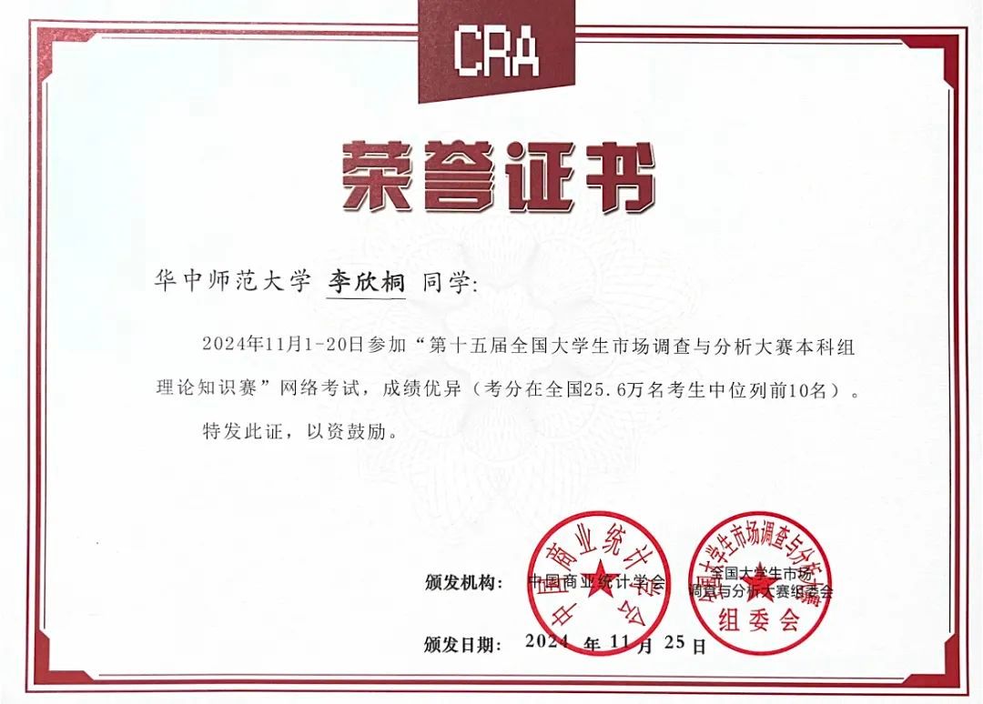 大赛前期的理论知识网络考试阶段,数统学院2022级本科生李欣桐的网考成绩位列全国前10名(全国各地共25.6万名考生同台竞技),这是我校学生首次获得此项荣誉,实现了历史性突破。