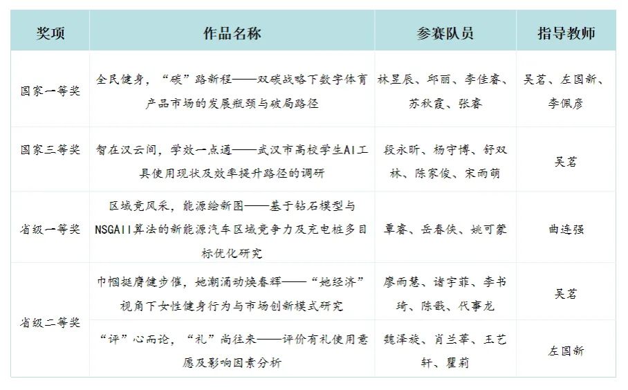 由我院吴茗、左国新、李佩彦三位老师指导的“马到成功”团队的《全民健身,‘碳’路新程——双碳战略下数字体育产品市场的发展瓶颈与破局路径》项目荣获国家一等奖,《智在汉云间,学效一点通——武汉市高校学生AI工具使用现状及效率提升路径的调研》项目荣获国家三等奖。