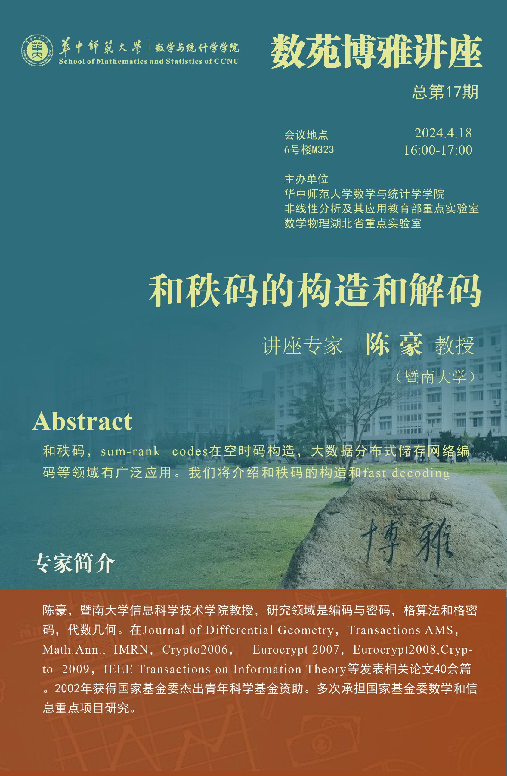 陈豪,暨南大学信息科学技术学院教授,研究领域是编码与密码,格算法和格密码,代数几何。在Journal of Differential Geometry,Transactions AMS,Math.Ann.,IMRN,Crypto2006,Eurocrypt 2007,Eurocrypt2008,Crypto 2009,IEEE Transactions on Information Theory等发表相关论文40余篇。2002年获得国家基金委杰出青年科学基金资助。多次承担国家基金委数学和信息重点项目研究。